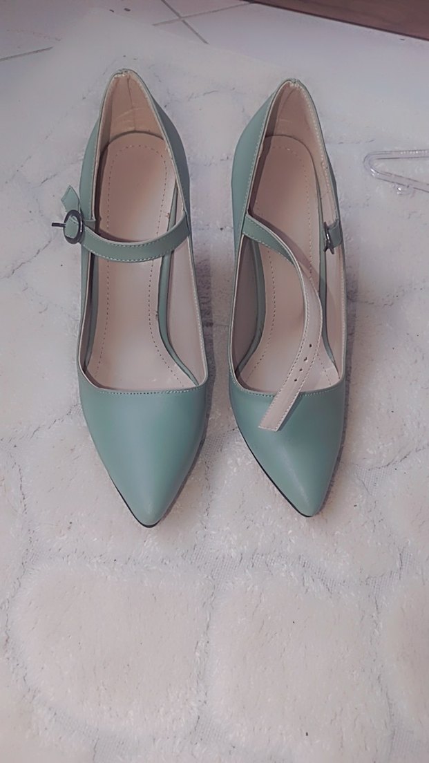 Yeşil pastel renkte, tokalı ve ince topuklu kadın ayakkabısı, sade ve klasik şıklık sunar. Günlük kullanıma uygundur. sıfır ürün