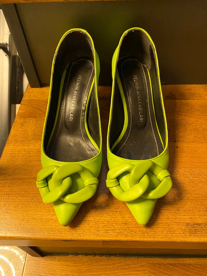35 numara Yeşil renkte, tokalı topuklu stiletto. Kauçuk malzemeden yapılmış, modern ve avangart tarzda,