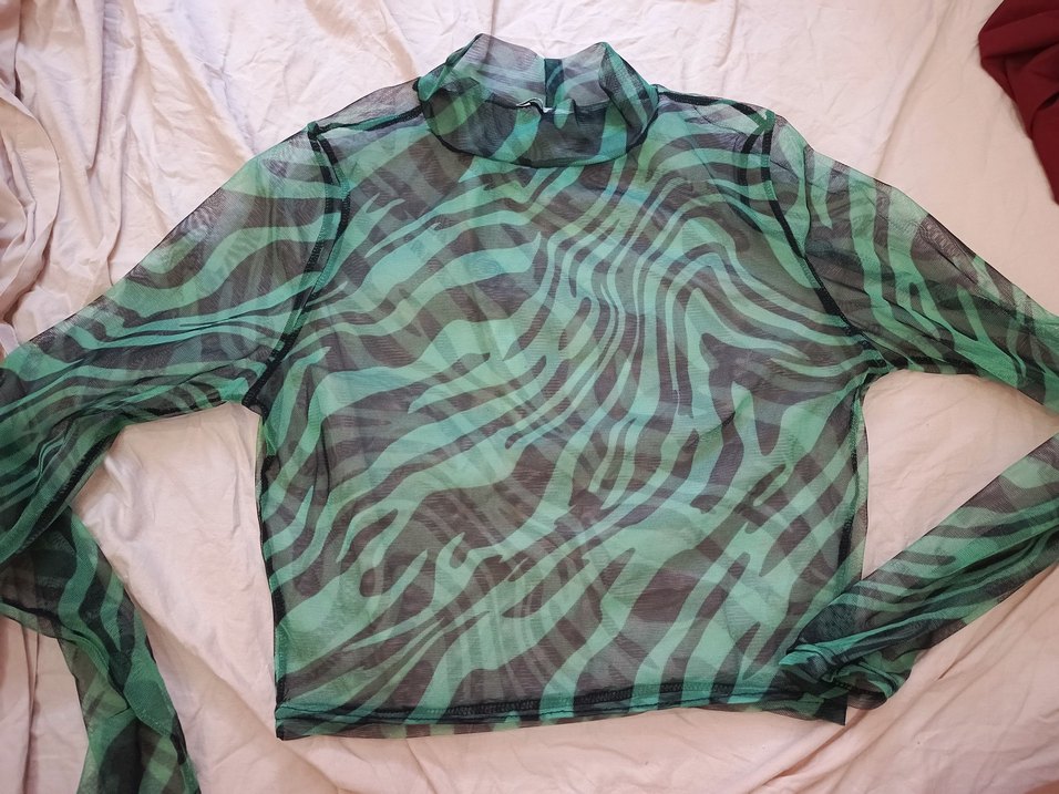 Fitted kesim, yeşil tie-dye desenli, transparan sentetik kumaştan yapılmış, balıkçı yaka ve kısa kollu kadın bluzu. Sokak modası ve grunge punk tarzına uygundur.