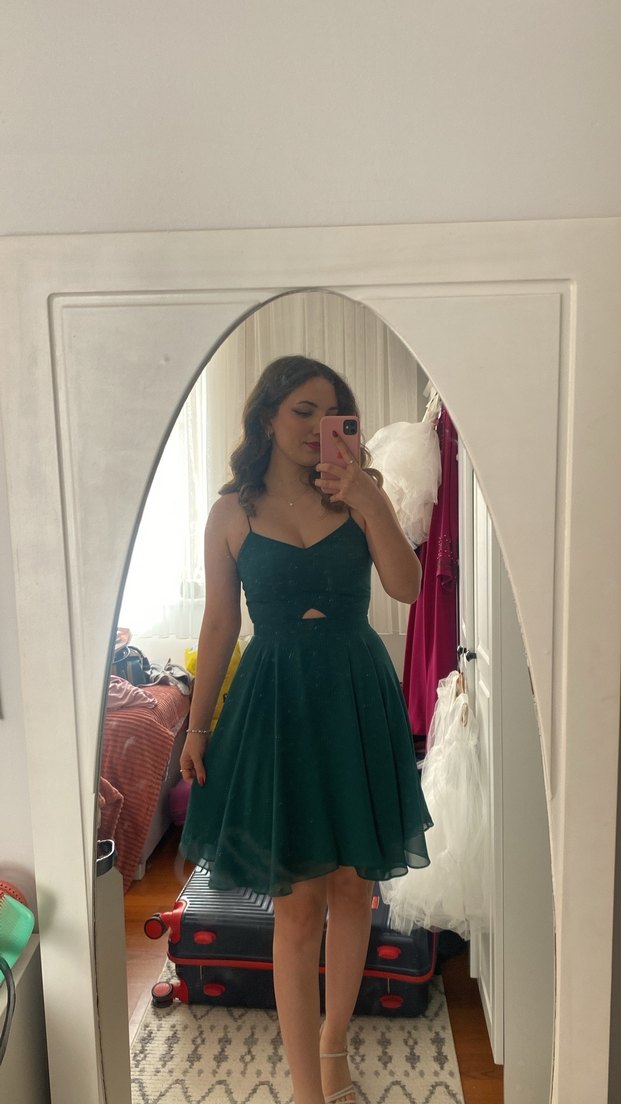 Yeşil, transparan detaylı, straplez ve ince askılı, vücuda oturan midi boy mezuniyet elbisesi, göz alıcı ve cesur bir tarz sunar.