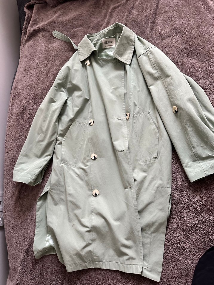 Düğmeli, yeşil midi yağmurluk, uzun kollu ve notalı yakalıdır. Sentetik kumaştan yapılmış, baskılı ve rahat kesimdir. Marka: Robin. ☔