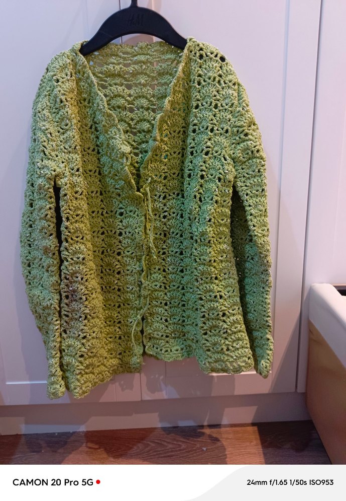 Yeşil renkte, uzun kollu, yuvarlak yakalı ve bol kesim triko bohem tarzda kadın hırkasıdır. Parlak ve desen içermeyen yapısıyla günlük kullanıma uygundur. beklemekten leke olmuş çıkar mı bilmiyorum