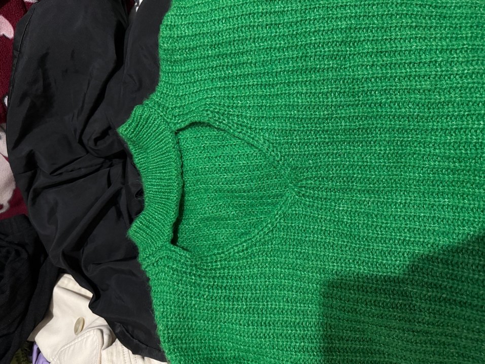 Yeşil, parlak dokulu triko kumaştan yapılmış, bisiklet yaka ve normal boyda, sokak modasına uygun salaş kazak.