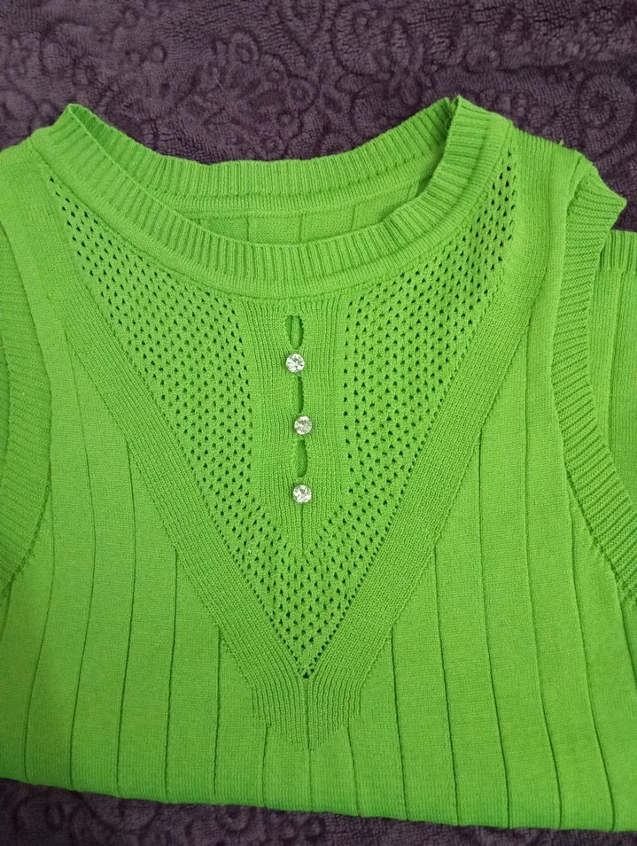 Bu yeşil triko kazak, yuvarlak yaka ve uzun kollu olup, rahat örgü dokusu ve önünde süs düğmeleri bulunur. Günlük kullanım için uygundur.