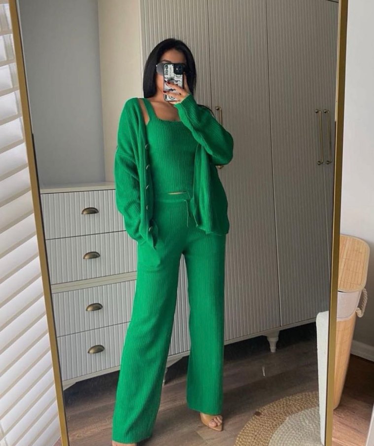 Yeşil renkli, straplez üst, uzun kollu hırka ve bol paça pantolondan oluşan triko kadın üçlü takım. Normal kesim ve midi boyda, günlük rahat şıklık için uygundur. ✨ Esnek olduğu için L bedene kadar uygundur.