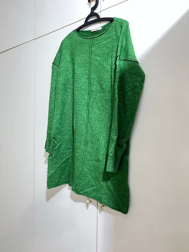 Yeşil renkli, parlak görünümlü, triko dokuma uzun kadın sweatshirt. Yuvarlak yaka ve uzun kolludur. Rahat tüylenmeler var fotoğrafta göründüğü gibi