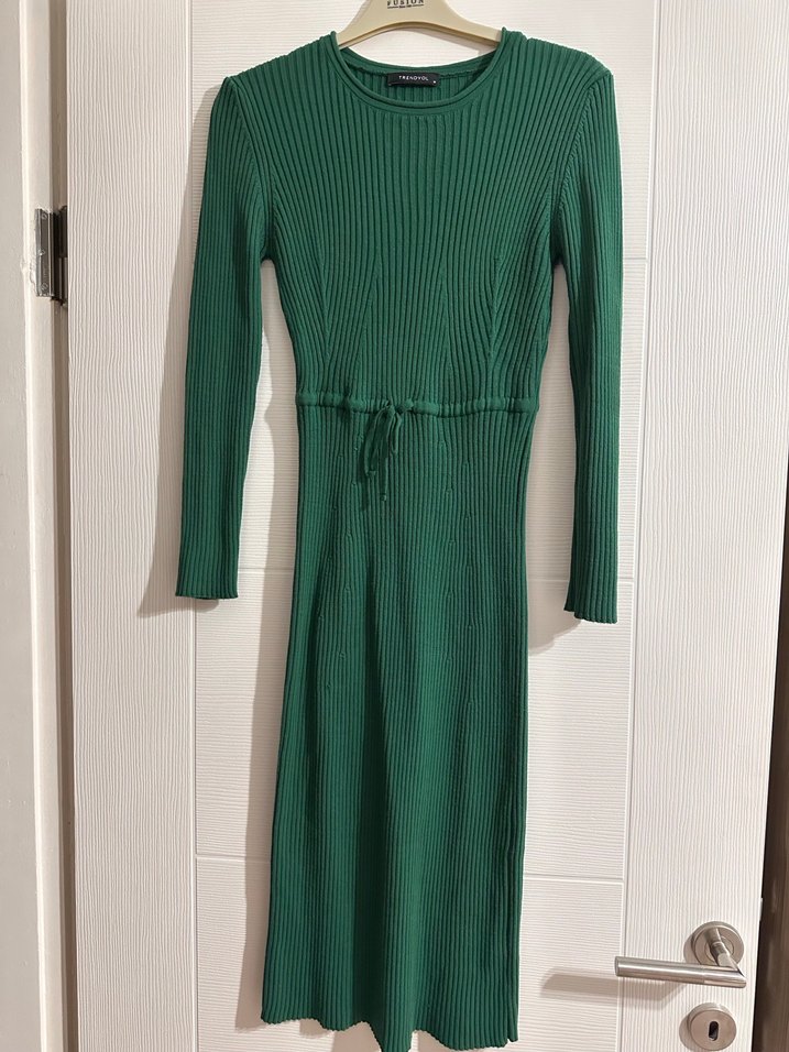 Uzun kollu, yuvarlak yaka ve triko kumaştan üretilmiş yeşil uzun elbise. Vücuda oturan kesimiyle modern ve rahat bir stil sunar.