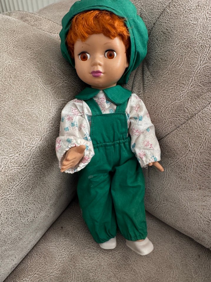 Bu oyuncak bebek yeşil tulum ve başörtüsü ile beyaz çiçekli bluz giymektedir. Kahverengi gözlü ve kırmızı saçlıdır.