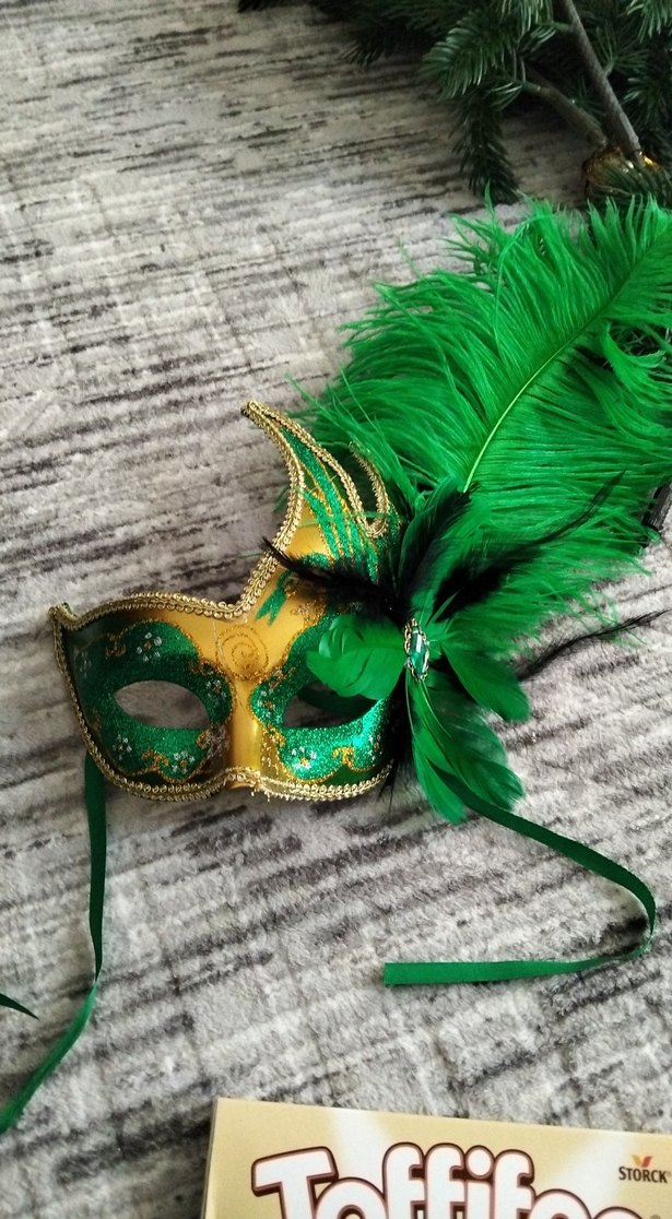 Yeşil tüyler ve sim detaylarıyla süslenmiş, kurdele bağlamalı karnaval maskesi.