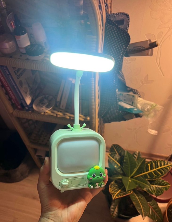 Esnek boyuna ve sevimli yeşil karakterli TV şeklinde tabana sahip açık yeşil masa lambası. Çalışma alanınızı aydınlatmak için parlak ışık sağlar.
