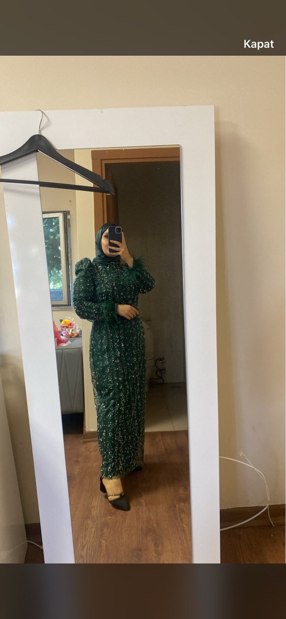 Koyu yeşil, uzun kollu kadın elbisesi yüksek yakalı, drapeli ve batik desenlidir. Rahat kesim ve sade bohem tarzındadır.