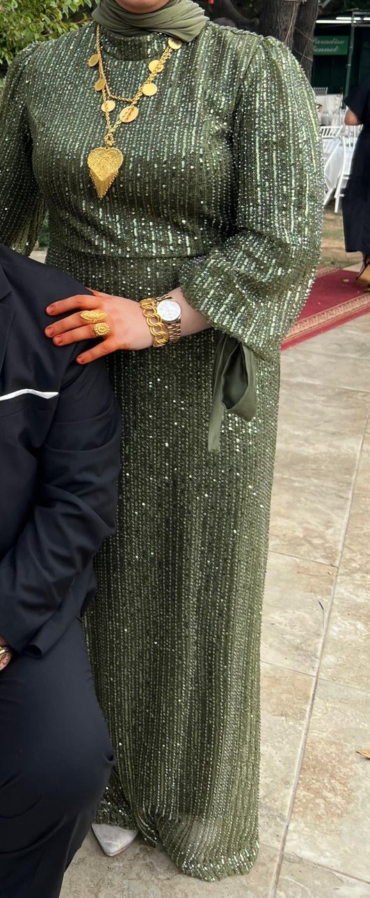 Pul işlemeli, haki renk, uzun ve vücuda oturan abiye elbise. Yaka detayında kesik ve ince askılı kollara sahip. Zarif yılan desenli, gösterişli tasarım.