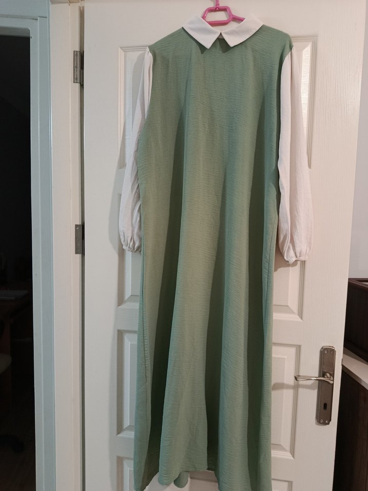 Uzun, bol kesim ayrobin elbise, pastel yeşil gövde ve beyaz uzun kollara sahip. Drapeli, minimalist ve sade tasarımlı, günlük kullanıma uygun.