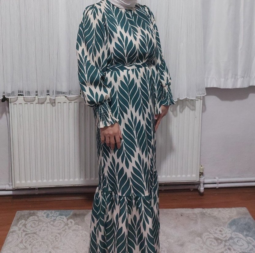 Yüksek yakalı, uzun kollu ve dökümlü tasarımlı, bol kesim yeşil bağlamalı uzun elbise. Sentetik kumaştan, mütevazı bohem tarzında.
