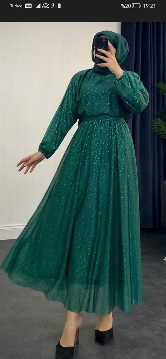 Yüksek yakalı, bol kesim ve drapeli detaylara sahip uzun koyu yeşil elbise. Pürüzsüz sentetik kumaştan, klasik ve vintage ofis stiline uygun.