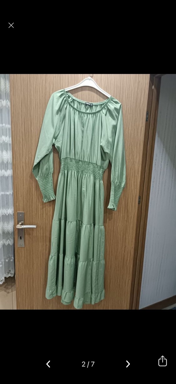 Pastel yeşil bohem elbise, bol kesim, kayık yaka ve pileli keten kumaştan yapılmıştır. Askılı kollu ve desen içermeyen rahat bir tasarıma sahiptir.