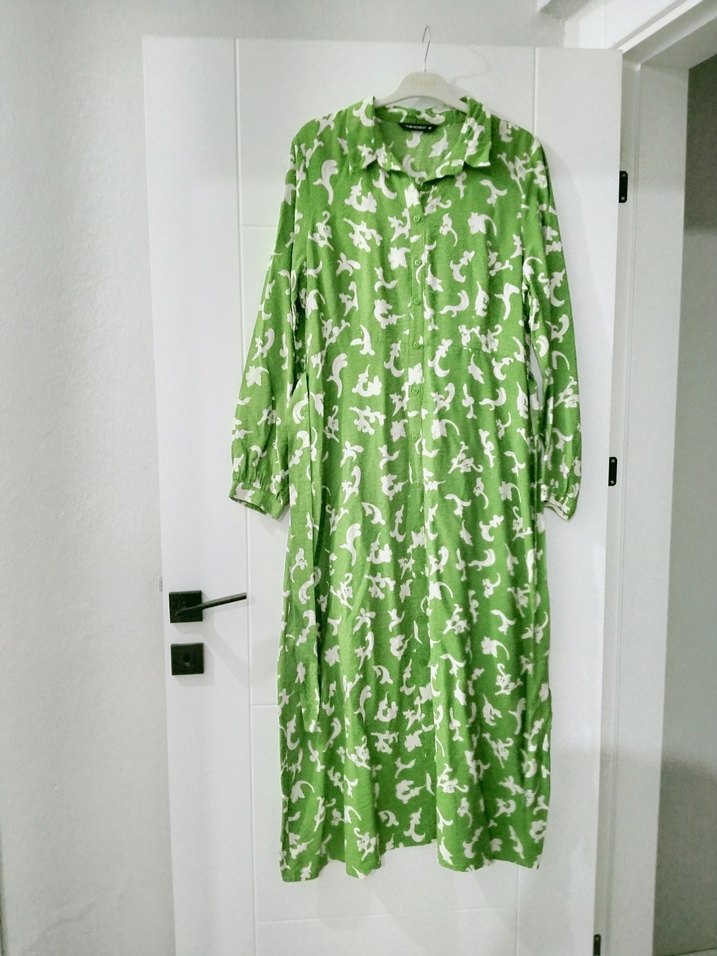 Yeşil renkli, yüksek yakalı ve uzun kollu bohem tarzda uzun kadın elbisesi. Salaş kesim, drapeli ve renkli tie-dye deseniyle günlük kullanım için uygundur. düğmeleri dikilidir. açılmaz. seyyar kemerli elbise temizdir. fotoğraf kalitesi telefon sebebiyle düşüktür