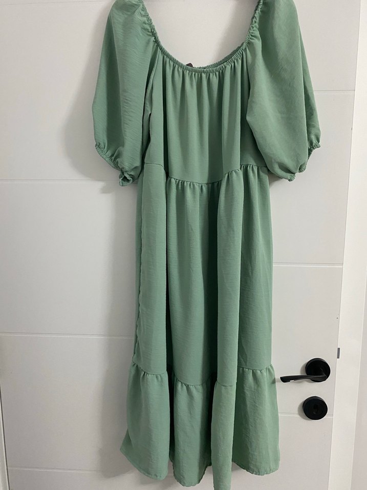 Yeşil renkte, bol kesim ve kayık yaka detaylı, askılı kollu uzun keten kumaş elbise. Fırfırlı tasarımıyla günlük kullanıma uygundur.