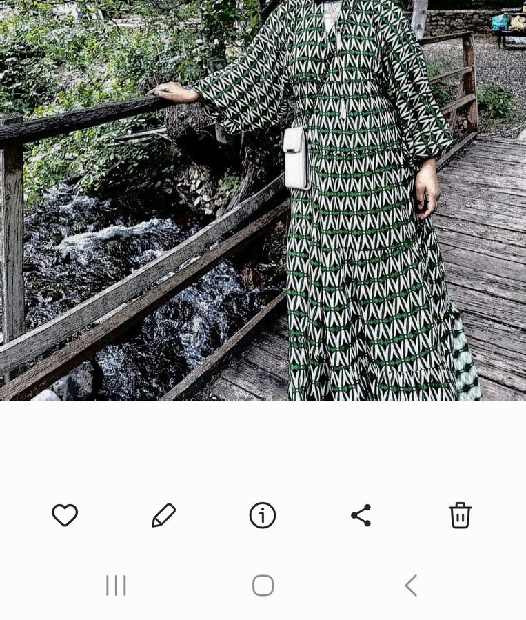 Yeşil uzun bohem elbise, salaş kesim ve drapeli uzun kollara sahiptir. V yaka ve koyu tonlarda batik desenlidir, günlük kullanım için uygundur.