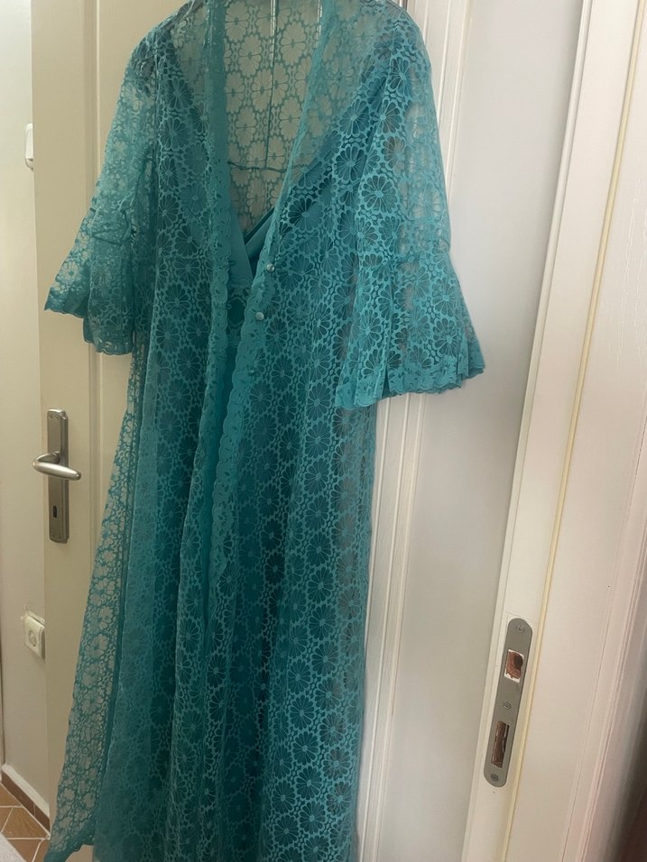 Yeşil renkte, uzun kesim, bol ve askılı kollu, parlak vintage bohem tarzda dantel detaylı kadın gecelik ve sabahlık. 50 yıllık, çok az kullanıldı.