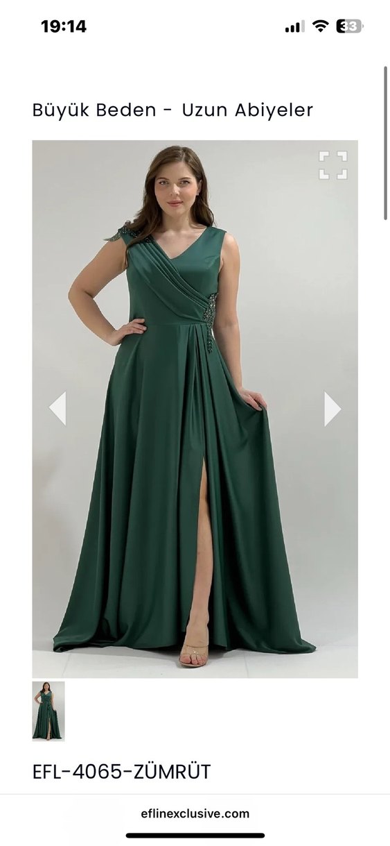 Yeşil uzun abiye elbise, drapeli V yaka ve kolsuz tasarıma sahiptir. Bol kesimli ve parlak dokuludur, düğünler için uygundur. 168cm boy 80 kilo ile giyildi