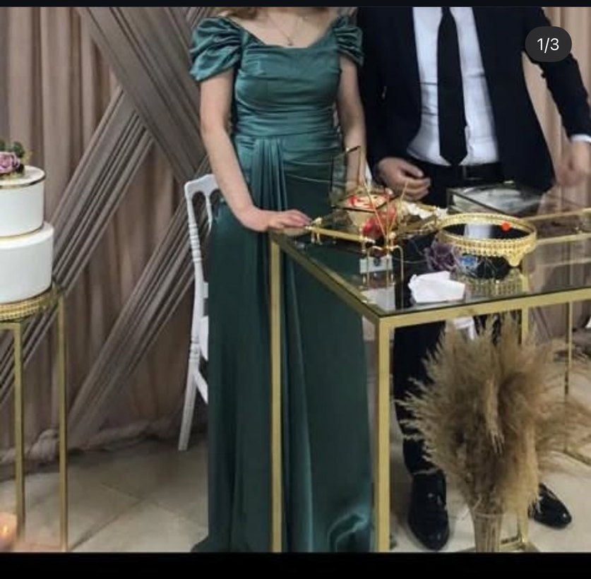 Bu uzun yeşil abiye elbise, kayık yaka ve askılı kollara sahip, drapeli tasarımı ile parlak bir görünüme sahiptir. Düğün için uygun, klasik ve vintage tarzı bir arada sunar.