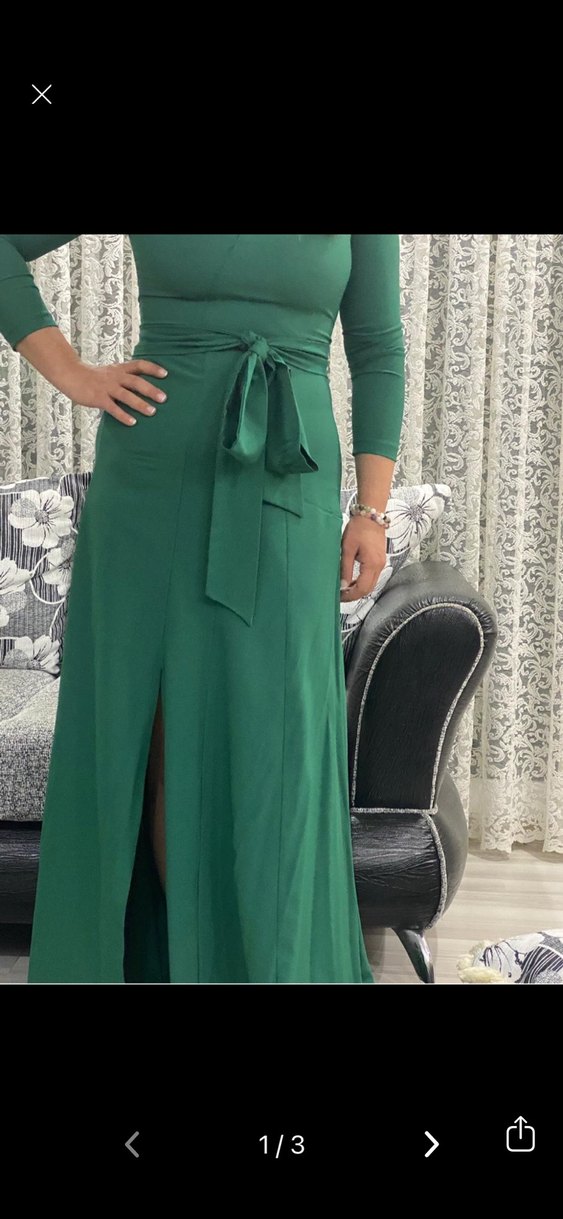 V yaka ve uzun kollu drapeli tasarıma sahip, yeşil uzun ve vücuda oturan abiye elbisedir. Düğünler için uygundur.