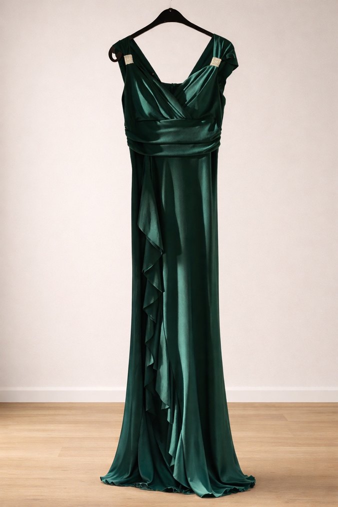 Yeşil parlak kumaştan, drapeli ve askılı uzun, dar kesim abiye elbise, düğünler için uygundur. Esnektir