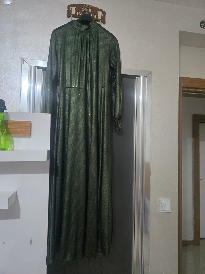 Yeşil parlak kumaştan, drapeli ve uzun kollu, yüksek yakalı uzun abiye elbisedir. Modest kesimli, bohem tarzda, düğünlere uygundur.