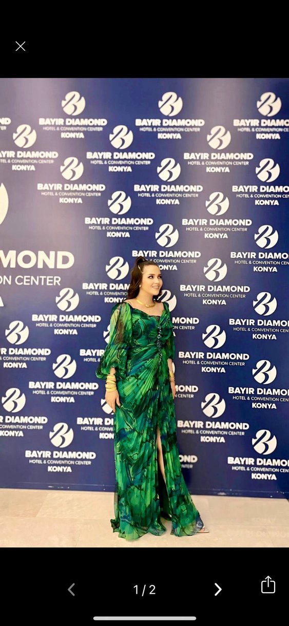 Uzun, yeşil, drapeli ve bol kesim elbise. Sentetik kumaştan, uzun kollu ve parlak batik desenlidir. Parti için uygundur. Önünde dekolte vardı kendi isteğimle pay eklettirdim isteğe göre çıkar