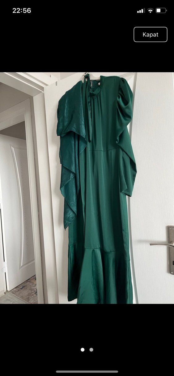 Yüksek yakalı, bol kesim yeşil uzun elbise, drapeli detaylar ve ince askılarla, yumuşak sentetik kumaştan. Bohem tarzı için uygun.