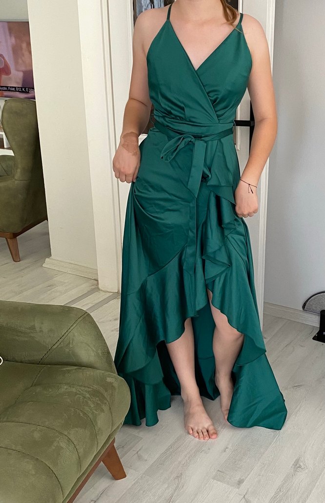Yeşil uzun elbise, straplez yakalı ve ince askılıdır. Parlak sentetik kumaştan, drapeli detayları ve bel kuşağı vardır. Düğünler için uygundur. ✨