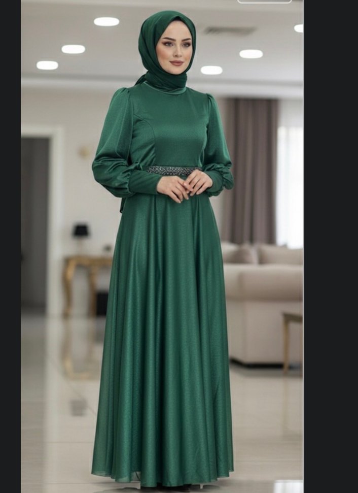 Yeşil Uzun Drapeli Kadın Abiye Elbise