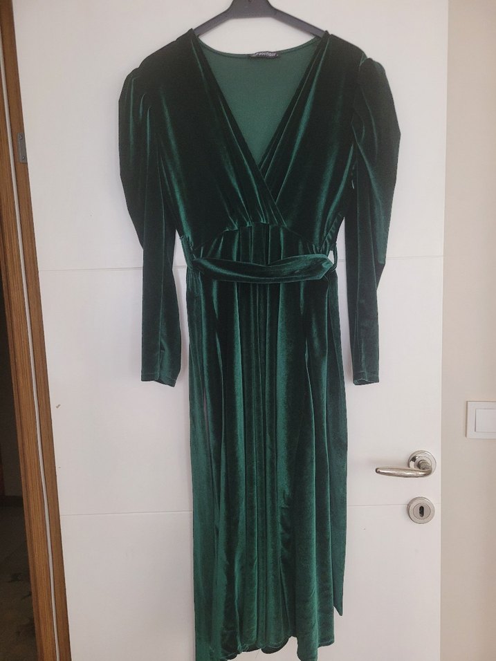 Koyu yeşil uzun elbise, drapeli detaylar ve V yakasıyla klasik ve modern tarzı birleştirir. Yumuşak sentetik kumaştan, ofis için uygun. omuzları hafif vatkalı doğumumda bebek mevlidinde bir kere giydim dolapta yer kaplıyor diye satıyorum çok sevdiğim bir parça ama attık kullanabileceğim bir yer yok. S M bedenede çok guzel uyum sağlıyor beli lastikli ve kusakli.