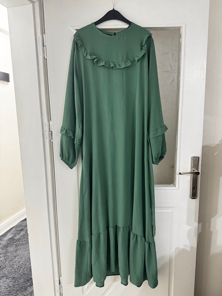 Koyu yeşil renkte, kumaştan, bol kesim uzun elbise. Fırfır detaylı, yuvarlak yakalı ve uzun kollu, minimal bohem tarzda, sade ve rahat.