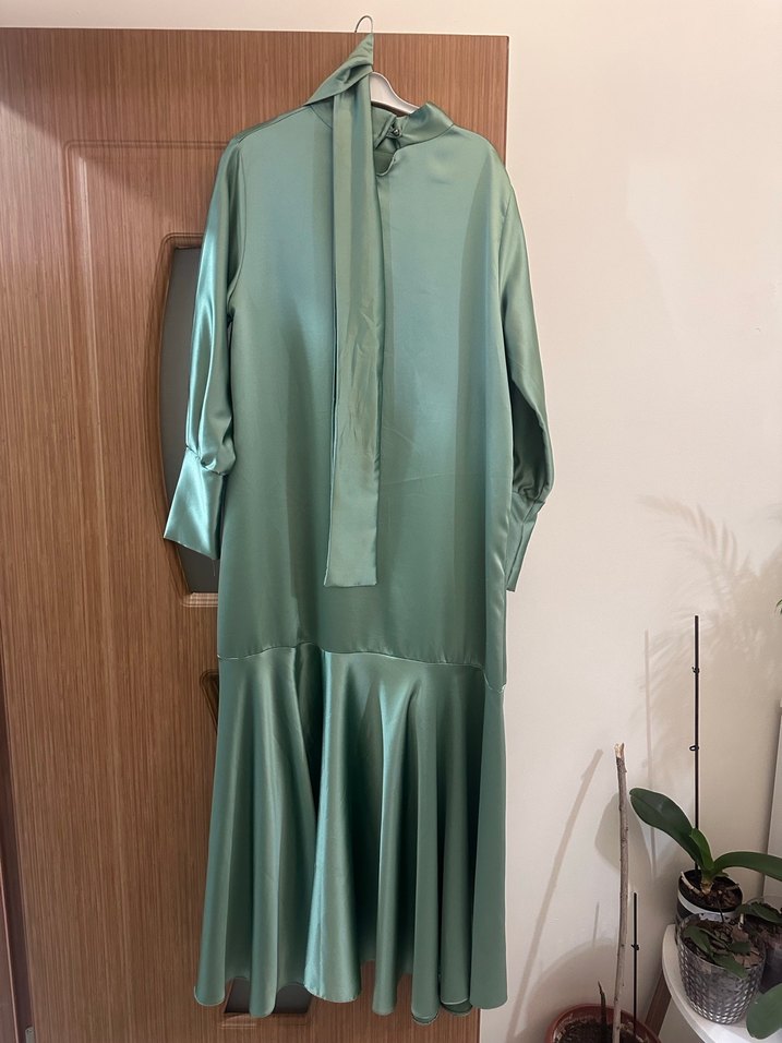 Parlak yeşil uzun elbise, saten dokulu ve dökümlü tasarıma sahip. Yüksek yakalı ve uzun kollu, modern klasik stilde, ofis için uygun. ✨