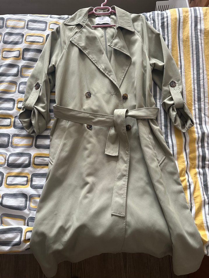 Acık yesil(tonu çok güzel her renkle giyilebilir)renkte, uzun ve düğmeli kadın trençkot. Kuşaklı, cepli ve notched yaka detaylı, bol kesimdir. Günlük rahat tarz için uygun. Aşırı az kullandım. Hiçbir defosu yoktur.