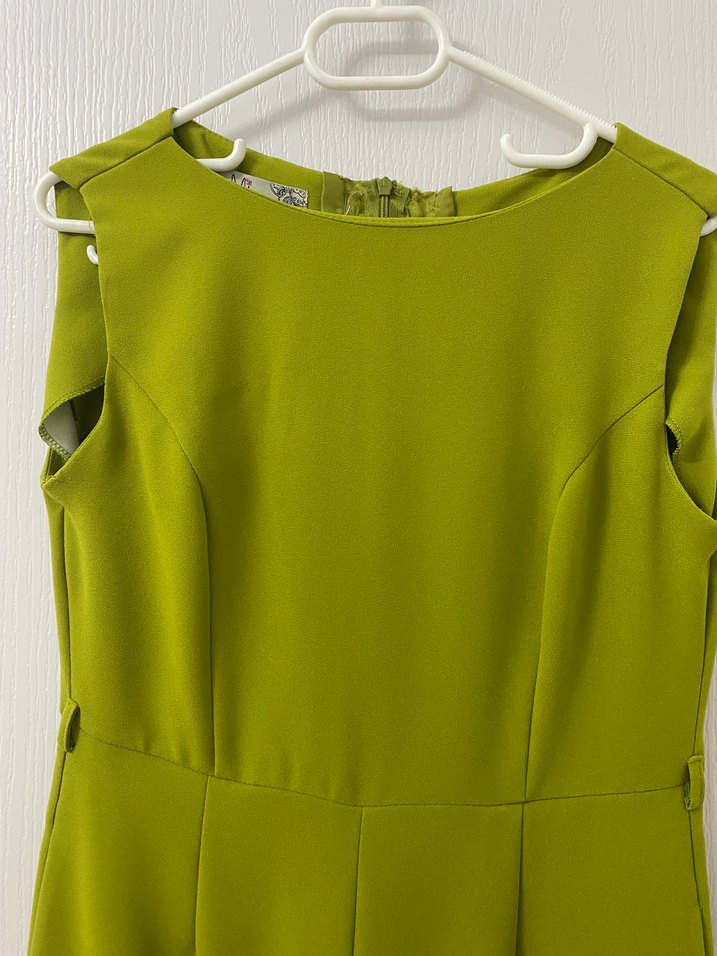 Bu uzun yeşil tulum, askısız yaka ve drapeli tasarıma sahip, parlak sentetik kumaştan üretilmiştir. Düzenli kesim ve kolsuz stilde olup, ofis için modern klasik ve minimalist görünümdedir.