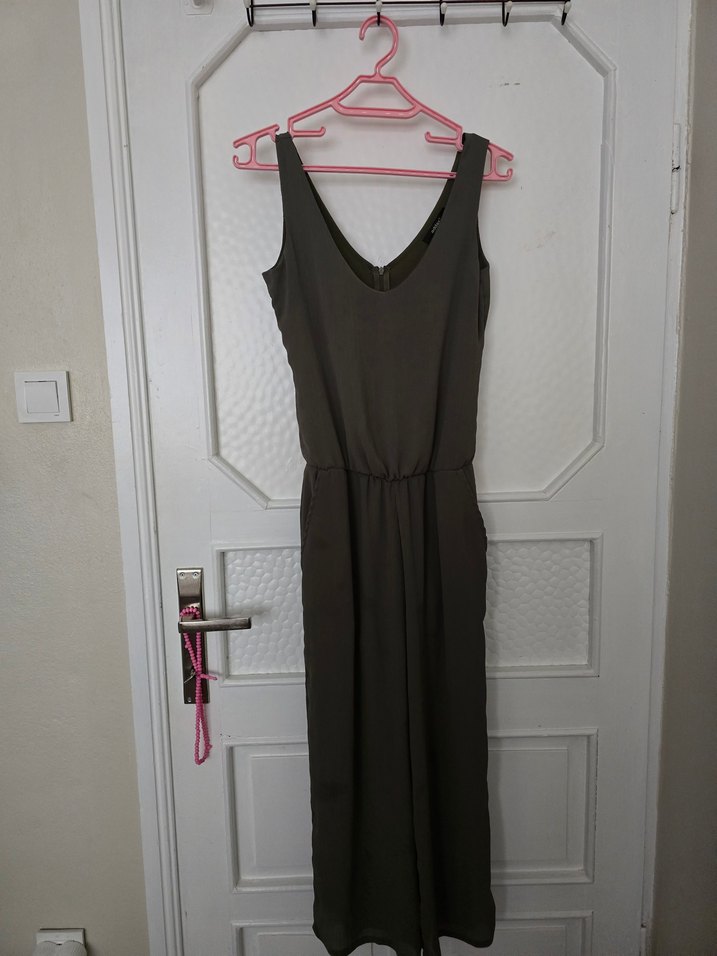 Yeşil, kolsuz, V yaka ve kemerli bu tulum, fitted kesime sahip. Sentetik kumaştan üretilmiş, minimalist ve trend sokak stili sunar. Günlük kullanıma uygun.