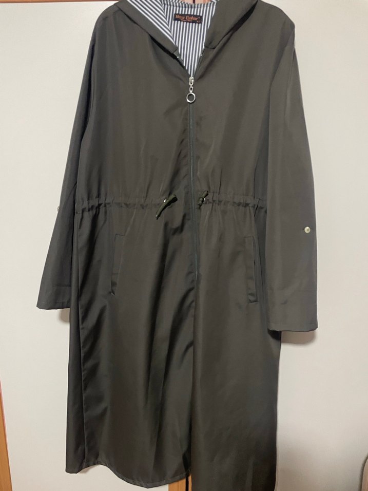Yeşil renkte, kemerli ve uzun kollu, bol kesim kadın trençkot bir iki kez giyildi ihtiyaç fazlası olduğu için satıyorum herhangi bir kusuru yok