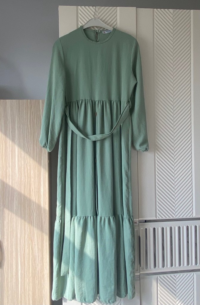 Yeşil renkte, keten kumaştan uzun elbise. Salaş kesim, pile detayları ve yuvarlak yaka ile günlük kullanıma uygun. Bohem ve minimalist tarzda.