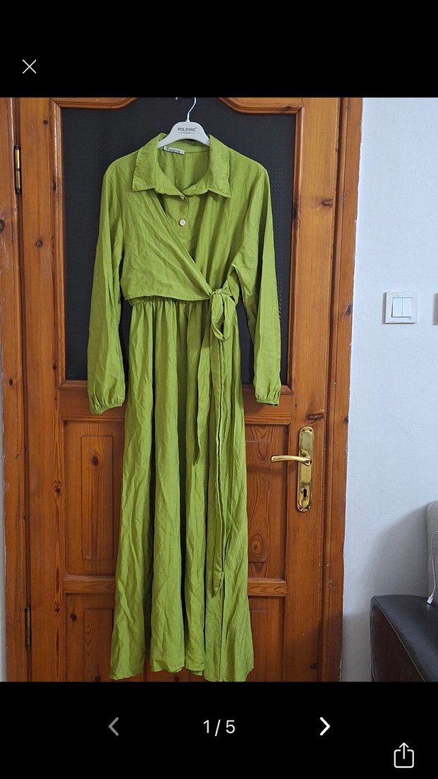 Uzun yeşil keten elbise, drapeli tasarım, notched yaka ve bol kesimle. Uzun kollu ve bağlamalı bel detaylıdır. Yeni gibi bir sorunu yok