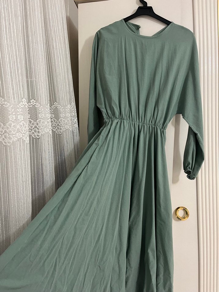 Pastel yeşil uzun elbise, keten kumaştan ve bol kesimdir. Drapeli, uzun kollu ve yüksek yakalıdır, günlük kullanıma uygundur.