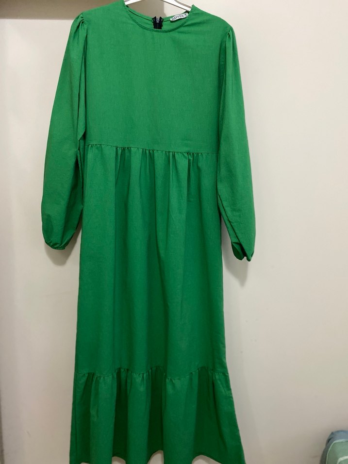 Yeşil Uzun Keten Elbise, Fırfırlı, Bol Kesim