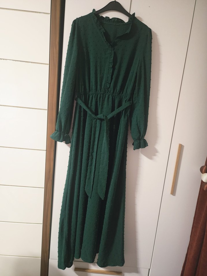 Koyu yeşil uzun keten elbise, yüksek yakalı ve fırfırlı uzun kolludur. Kuşaklı bel detayıyla bol kesim sağlar, bohem vintage tarzındadır.