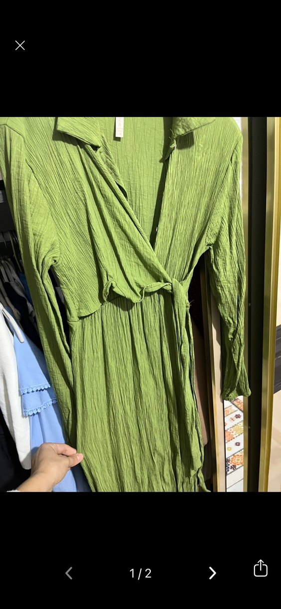 Yeşil uzun keten elbise, bol kesim ve uzun kolludur. Drape detaylı, parlak görünümlü ve V yakalıdır, günlük rahat kullanım için uygundur.