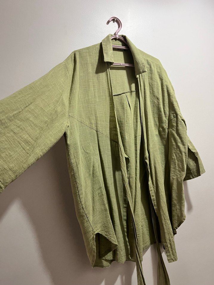 Yeşil keten kumaştan, uzun kollu, yakası kesikli, bol kesim ve dökümlü kadın kimono. Minimalist ve bohem tarzda, günlük kullanıma uygun.