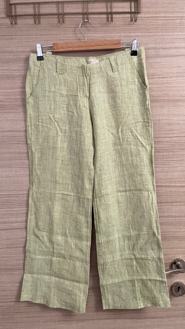 Yumuşak keten kumaştan yapılmış, düşük bel kesim kadın pantolonu, günlük tarz için uygun.