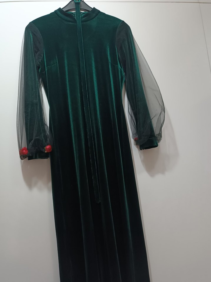 Koyu yeşil, yüksek yakalı ve uzun tül kollu, işlemeli detaylara sahip dar kesim uzun elbise, gotik parti tarzı için uygundur. Kadife bir kez giyildi