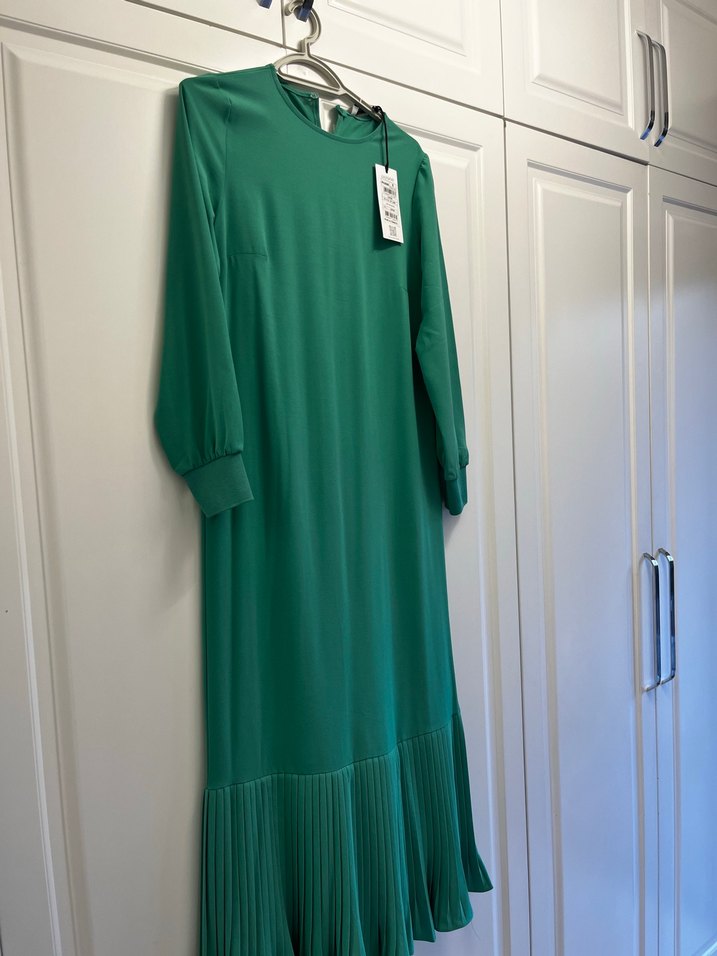 Yeşil Uzun Kol Pliseli Kadın Elbise